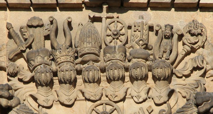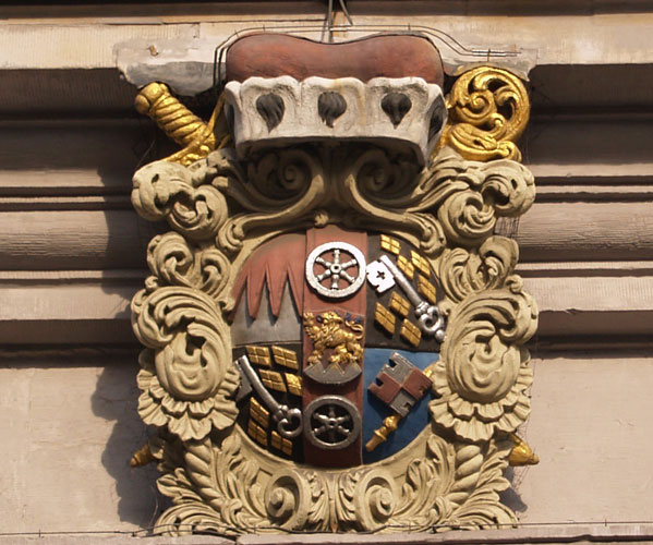 Dazu werden sechs Helme geführt. Das ist eine große Seltenheit, das Wappen dieses Kurfürsten mit vollständigem Oberwappen in der Bauplastik zu finden.
