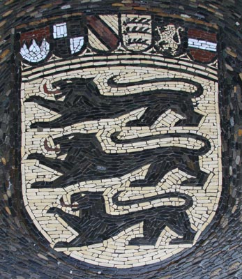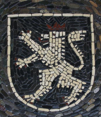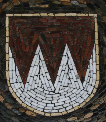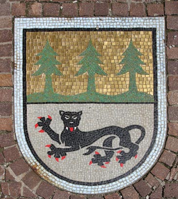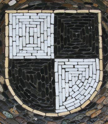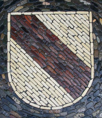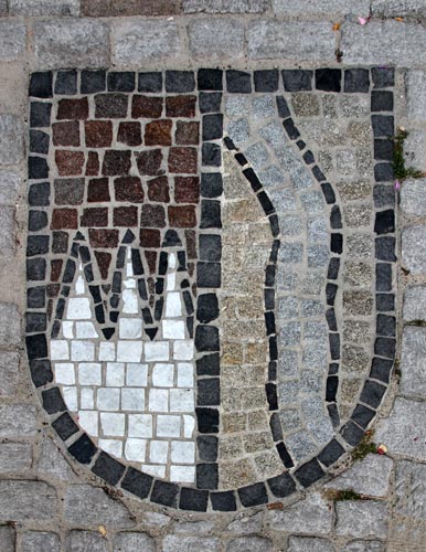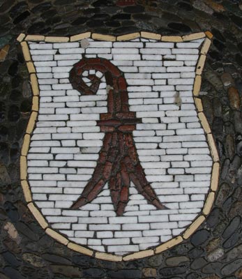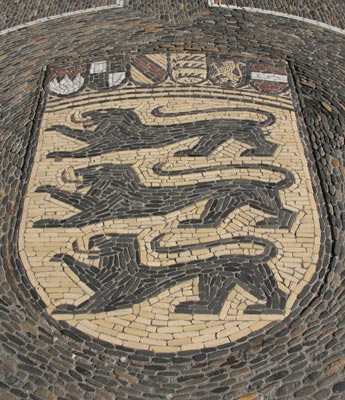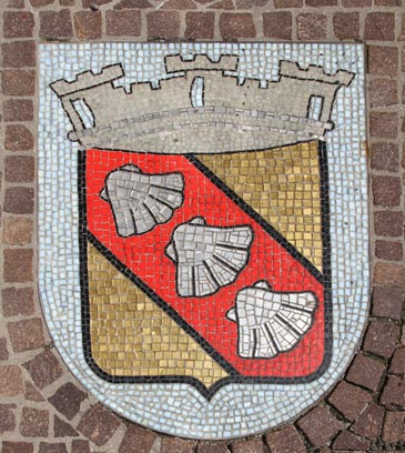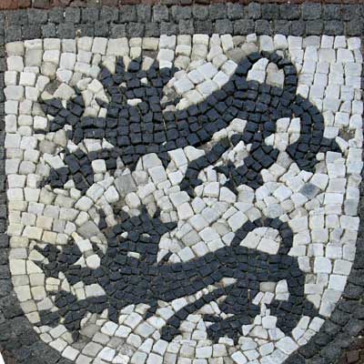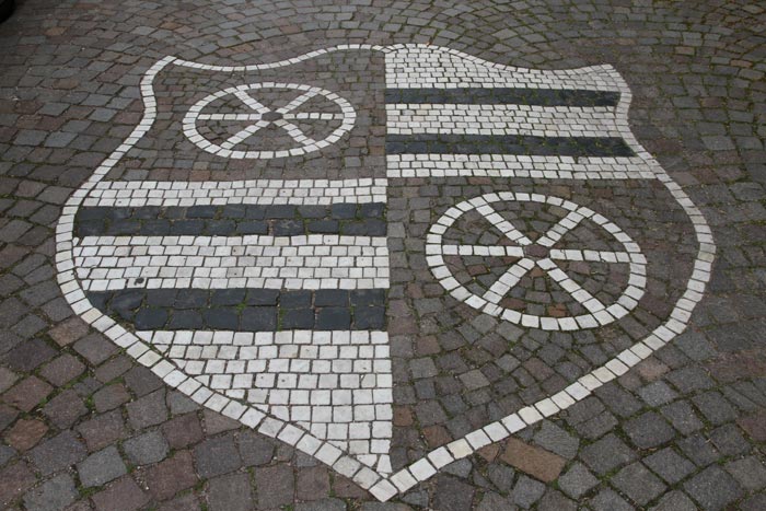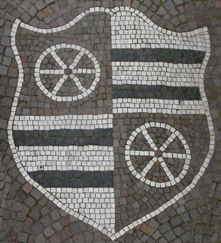 Normalerweise muß man sich die Hälse recken, um die Wappendarstellungen in großer Höhe an Fassaden oder über Portalen zu erkennen, und nicht selten werden die photographischen Möglichkeiten an ihre Grenzen geführt. Doch es gibt Heraldik auch zu unseren Füßen, insbesondere im Bereich kommunaler Heraldik, sei es als Pflaster-Mosaik auf öffentlichen Plätzen, seien es ins Pflaster eingelegte kunstvolle Metallarbeiten - Verschönerung öffentlicher Orte und Stärkung des Gemeinschaftsgefühls mittels des verbindenden Kommunalwappens.