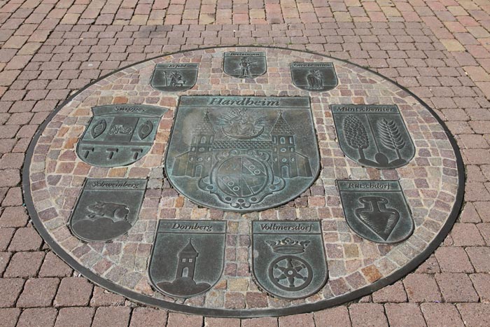 Eine weitaus hochwertigere und qualitätvollere Variante in den öffentlichen Raum eingelegter kommunaler Wappendarstellungen sind in das Pflaster eingelassene Metallplatten (Bronzegüsse) mit den entsprechenden Wappendarstellungen. Eine solche finden wir zwischen dem Grabenübergang zum Hauptportal des Schlosses von Hardheim einerseits und dem Schüttungsbau andererseits. Um den Wappenschild der Stadt Hardheim sind kreisförmig insgesamt neun weitere Wappenschilde von sieben zu Hardheim gehörenden Ortsteilen und ehemals selbständigen Gemeinden sowie von zwei Partnergemeinden im europäischen Ausland angeordnet. Dieses im Zuge der Neugestaltung des Schloßplatzes angefertigte Arrangement wurde anläßlich des des Partnerschaftstreffens bei der 950-Jahrfeier der Gemeinde Hardheim im Mai 2000 der Öffentlichkeit übergeben.