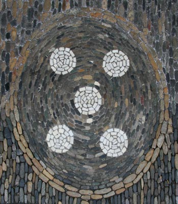 Das gleiche Pflastermosaik, am PC entzerrt. Es handelt sich um das Wappen des Fürsterzbischofs Diether von Isenburg (reg. 1459-1461, erste Amtszeit, 1475-1482, zweite Amtszeit). Steinheim war 1425 durch Verkauf an das Hochstift Mainz gekommen.