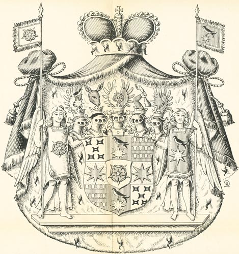 5 gekrönte Helme (im Siebmacher Band Fürsten sind viele Ungereimtheiten, Ströhl ist hier die verläßlichere Quelle; Reihenfolge der Helme nach Ströhl):