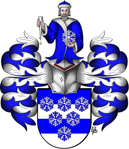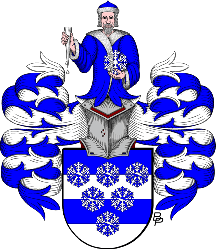 Blasonierung: Dreimal von Blau und Silber geteilt, die Teilungslinien erst nach oben, dann nach unten zu den jeweils beiden Hälften von sechs (3:2:1) aufrechten, sechszähligen Schneekristallen ausgezogen, auf dem Helm mit blau-silbernen Decken ein wachsender, silberbärtiger Mann in blauem, mit silbernem Pelz aufgeschlagenen Mantel und mit ebensolcher Mütze, in der Rechten einen silbernen Eiszapfen haltend, in der Linken einen silbernen Schneekristall vor sich haltend.