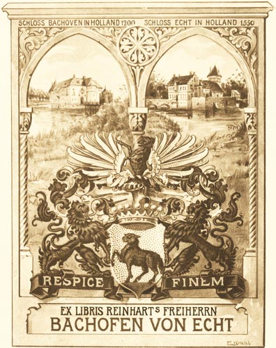 Zwei Löwen halten das Wappen, beide stehen auf je einem Abschnitt des Schriftbandes "Respice finem" - "denk an das Ende". Die abgebildeten Schlösser Bachoven (Baakhoven, Provinz Limburg) und Echt (Echt-Susteren, Provinz Limburg) sind Güter bei Roermond. Die Familie entstammte den Niederlanden (Limburg), ist aber nach Österreich eingewandert. Die Schlösser sind also Erinnerungen, die an die beiden Namen geknüpft sind. Die Familie betrieb in Wien die Nußdorfer Brauerei. In der Steiermark besaßen die Freiherren seit 1902 Schloß Murstätten (http://www.hengist.at/pdf/lebring/lebring_03.pdf). Freiherr Reinhart Bachofen von Echt (1877 - 1947), der Auftraggeber des vorliegenden Exlibris, ist als Heimwehrführer und Gründer der Steirischen Heimwehr, deren Anführer und Landesschatzmeister er zeitweise war, bekannt geworden. Weiterhin verfaßte er mehrere Werke zur steirischen Jagdgeschichte. Freiherr Reinhart Bachofen von Echt war seit 1904 mit Alice Pfizer (1877&ndash1959) vermählt, einer Tochter des bekannten Mitgründers des Pharmakonzerns Pfizer, Charles Pfizer (1824&ndash1906).