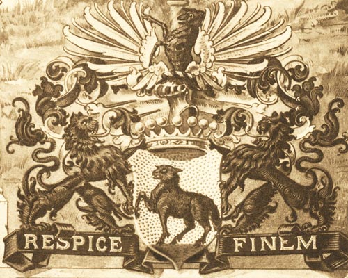 Ansicht eines Herrenhauses in einem Garten. Das Wappen ist