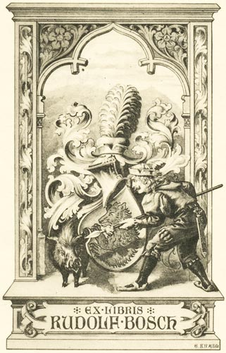 Dieses Wappen bekam eine Familie am 2.12.1467 von Kaiser Friedrich III. zu Wiener Neustadt verliehen; der Begünstigte war der 1491 in Dinkelsbühl verstorbene Friedrich Bosch. Die hier bei dem Exlibris vertretene, ursprünglich aus Wössingen in Mittelfranken stammende Familie bedient sich dieses Wappens, obwohl ein genealogischer Zusammenhang nicht festgestellt werden konnte. Es handelt sich also vorbehaltlich weiterer genealogischer Forschungsergebnisse um eine Übernahme durch die mittelfränkische, später österreichisch-böhmische Familie, die u. a. auf Altenbuch-Döberney bei Königinhof an der Elbe in Böhmen saß. Die Familie teilte sich in ihrem jüngeren Stamm in einen Wiener Ast und in einen Wallersteiner Ast. Der Wallersteiner Ast der Familie hatte sich in einen Zöbinger Unterast mit fünf Zweigen, in einen Jedleseer Unterast und in einen Nußdorfer Unterast aufgespalten.