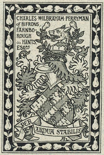 Charles Wilbraham Perryman (9.8.1860-14.4.1949), Esq., war Justice of the Peace in der county of Southampton und war Lord of the Manor of Ardley (Oxon.). Sein zweiter Vorname wird auch mit "Weston" angegeben, so auf der Geburtsurkunde. Weiterhin scheint "Felix" ein Spitz- und Rufname gewesen zu sein. Er heiratete in erster Ehe am 12.7.1884 in All Saints Gordon Square, Middlesex, Marie Louise Blumenstein. Er hatte 4 Kinder, Percy Otto St. Clair Wilbraham Perryman (22.6.1885-), Dorothy Theckla Florence Perryman, Cecil Rudolph Ernest Wilbraham "Tim" Perryman (4.12.1887-7.5.1971, Royal Navy), Herbert Alan Fortescue Wilbraham Perryman (13.6.1890-27.11.1973) und Marjorie Winifred Evelyn Wilbraham Perryman (14.1.1893-). Der in London lebende Charles Wilbraham Perryman wird 1891 als Inhaber einer Zeitung erwähnt, 1901 scheint er wohlhabend genug geworden zu sein, um aus eigenen Mitteln leben zu können. Am 22.2.1894 wurde er in die Freimaurerloge Euphrates Lodge No. 212, London, aufgenommen. Es existiert in der Sammlung ein weiteres Exlibris für den gleichen Eigner aus der Feder von C. Helard.