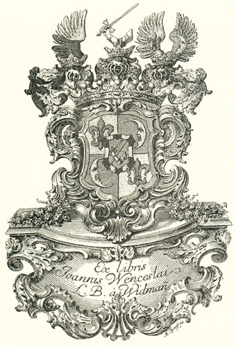 Das Blatt im Rokokostil wird unten im Schriftfeld als "Ex libris Joannis Wenceslai L(iberi) B(aronis) à Widman(n)" bezeichnet. Johann Wenzeslaus Freiherr von Widmann, Sohn von Johann Anton Ritter von Widmann und Lucia Maria Gögger von Löwenegg. Er stand erst in kaiserlichen militärischen Diensten, wurde 1741/1742 General-Landeskriegscommissar während der kriegerischen Auseinandersetzung mit Preußen, und 1744 wurde er Mitglied des Generalcommissariates bei der Errichtung der Landmiliz. Nach dem Krieg wurde er Staatsmann und wechselte in die Justizverwaltung. 1748 wurde er Assessor bei der k. k. mährischen Deputation für Contributions-, Cameral- und Militärangelegenheiten, dann k. k. und k. böhmischer und ungarischer bevollmächtigter Minister im fränkischen Kreise, bis 1763. Zeitweise war er österreichischer Gesandter am bayerischen Hof in München. Kaiserin Maria Theresia ernannte ihn am 9.8.1766 zum königlichen Oberstlandrichter in Mähren, und in diesem Amt finden wir ihn bis 1772. Seine Lebensdaten sind nicht bekannt, geboren ist er vermutlich im ersten Jahrzehnt des 18. Jh., und 1772 dürfte auch seinem Todesjahr entsprechen.