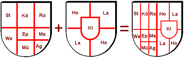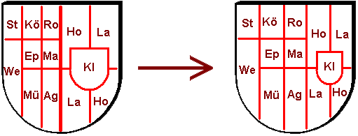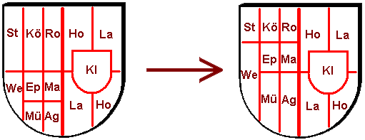 Daraus hat sich im Laufe der Zeit folgende, heraldisch und logisch unrichtige Beschreibungsweise entwickelt, die nicht der historischen Entwicklung Rechnung trägt, sondern der Verschiebung der Proportionen durch graphische Bedürfnisse: