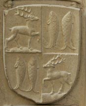 Abb.: Wappen am Eingang zum inneren Burghof in Schloß Büdingen. Hier ist es zu einer dritten Verschiebung gekommen. Das Feld für die Grafschaft Mark geht tiefer nach unten als das benachbarte Feld Eppstein, und drückt das Feld Agimont zusammen. Außerdem sind alle geschachten Elemente zu Kugeln geworden. Und auch in der linken Schild"hälfte" stimmen die Feldergrenzen nicht so ganz.