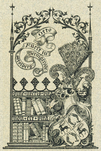 Abb.: Adolf Matthias Hildebrandt (16.6.1844-30.3.1918) hat dieses Exlibris für Otto Fürst zu Stolberg-Wernigerode angefertigt. Otto Fürst zu Stolberg-Wernigerode, Graf zu Königstein, Rochefort, Wernigerode und Hohnstein (30.10.1837-19.11.1896), Herr zu Eppstein, Münzenberg, Breuberg, Agimont, Lohra und Klettenberg, war der Sohn von Erbgraf Hermann zu Stolberg-Wernigerode (30.9.1802-24.10.1841) und Emma Gräfin zu Erbach-Fürstenau (11.7.1811-1.12.1889). Der auf Schloß Gedern aufgewachsene Otto war erst 4 Jahre alt, als sein Vater aus Verzweiflung über den Verlust seines ältesten Sohnes Albrecht starb. Otto studierte an den Universitäten in Göttingen und Heidelberg Staatsrecht, Geschichtswissenschaft und Kameralistik, machte aber keinen Abschluß, sondern machte eine kurze militärische Karriere 1859-1861 bei der preußischen Armee. Die dabei geknüpften Kontakte waren seiner späteren Karriere äußerst förderlich. 1861 übernahm er die Grafschaft Wernigerode. Er wurde 1854 erbliches Mitglied des preußischen Herrenhauses, war 1867-1873 Oberpräsident der Provinz Hannover, 1872-1876 Präsident des Preußischen Herrenhauses als Nachfolger seines Onkels Eberhard von Stolberg-Wernigerode. Er wurde 1876 deutscher Botschafter in Wien. Danach war er 1878-1881 stellvertretender Reichskanzler und Vizepräsident des preußischen Staatsministeriums, sozusagen "zweiter Mann hinter Bismarck". Er war 1882-1895 Vorsitzender des sächsischen Provinziallandtags und 1884-1892 Oberstkämmerer. Daneben war er 1885-1888 stellvertretender Minister des königlichen Hauses. Er war 1876-1896 Vorsitzender des Vereins der deutschen Standesherren. Er wurde am 22.10.1890 preußischer Fürst mit dem Titel Durchlaucht; der Fürstentitel war ihm bereits 1861 angeboten worden. Schließlich wurde er 1893 von Kaiser Wilhelm II. entlassen. Danach war er noch 1893-1896 Präsident des preußischen Herrenhauses in Berlin.
