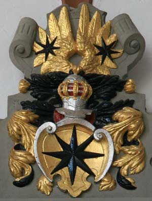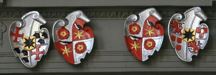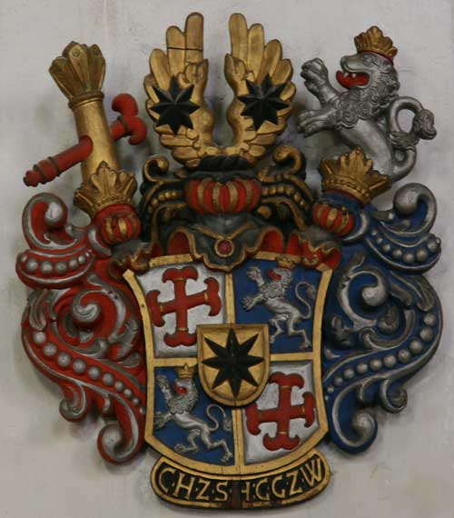 Beispiel: Wappentafel der Gräfin Catharina von Waldeck (1612-1649), Witwe des Grafen Simon Ludwig zur Lippe, die 1637-1643 die Regentschaft für ihren unmündigen Sohn Simon Philipp führte und die 1652 in St. Nicolai zu Lemgo bestattet wurde. 1643 heiratete sie Herzog Philipp Ludwig von Holstein, verstarb aber 6 Jahre später im Kindbett. Eine Bestattung in der Blomberger Familiengruft verwehrte man ihr.