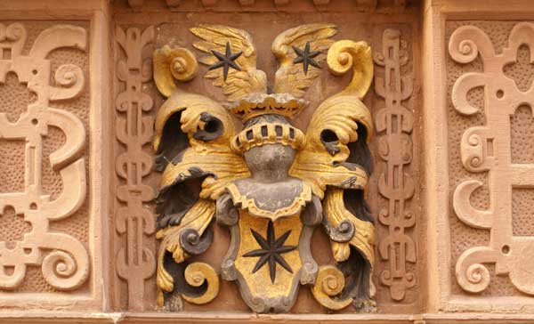 Bildbeispiel: Gaildorf, Neues Schloß, Wappen für Wilhelm Carl Philipp Otto Graf von Bentinck und Waldeck-Limpurg, Graf von Aldenburg (28.11.1848-2.11.1912), Teil eines Ehewappens am Vorbau der Parkfassade. Waldeck-Limpurg bildet Feld 3 eines gevierten Wappens, Hervorhebung der Felder für Limpurg. Hier fälschlicherweise nur drei statt vier Spitzen.