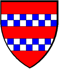 Steeg pfälzischer Burgmann zu Stahleck 1454 In Rot zwei weißblau geschachte Balken. Helmzier ein wie der Schild bezeichneter offener Flug. Helmdecke rot-silbern. Variante: Grün statt blau. |